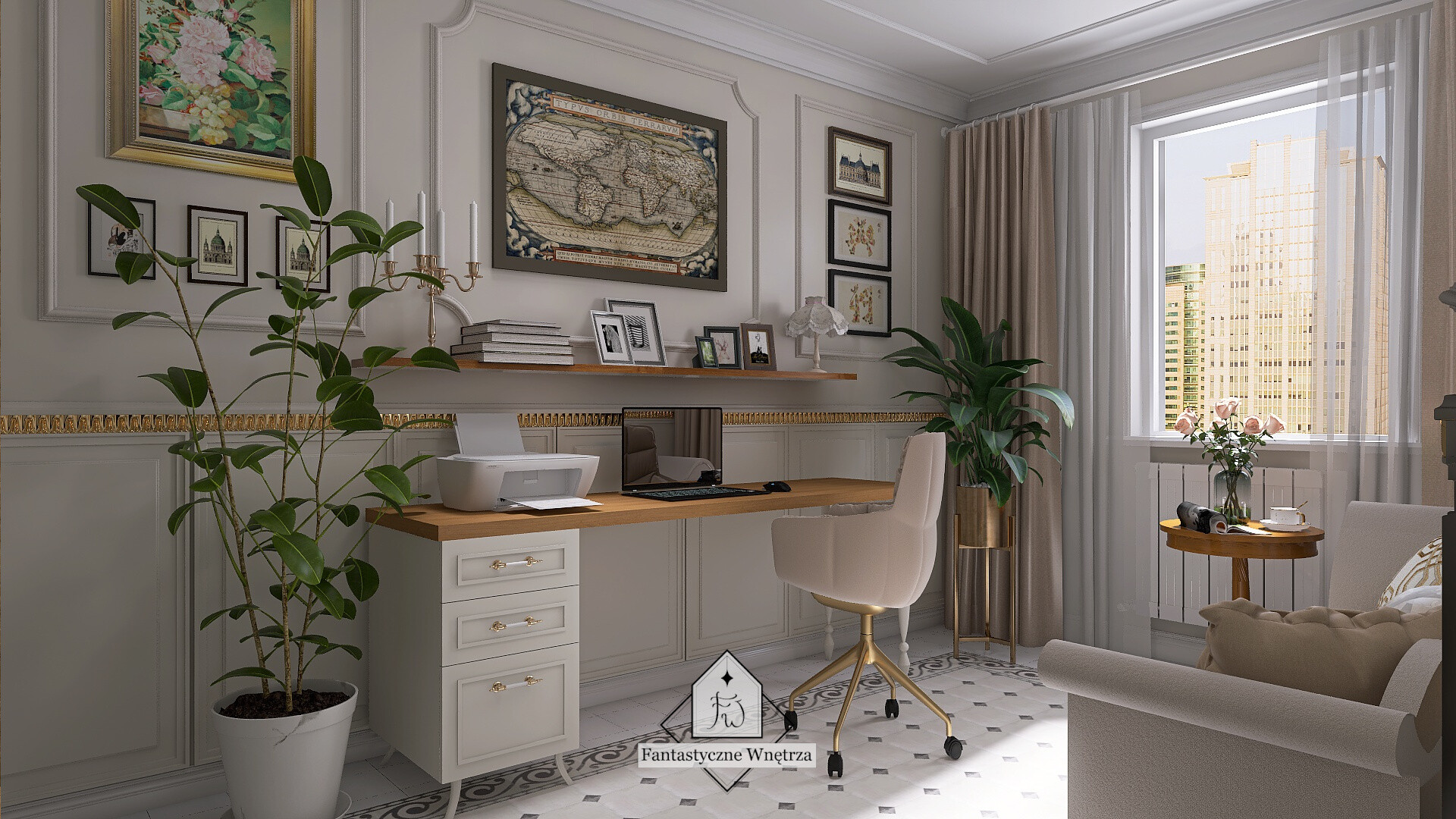 Naprzeciwko wejścia jest biurko z bardzo długim blatem oraz z szufladami na rzeczy podręczne. Na ścianie nad biurkiem półka na dekoracje, czy odkładanie dokumentów w trakcie pracy. Wzdłuż przeciwległej ściany stoi szezlong – jest to idealne miejsce do relaksu i czytania książek, czy po prostu zrobienia sobie przerwy w trakcie pracy.
