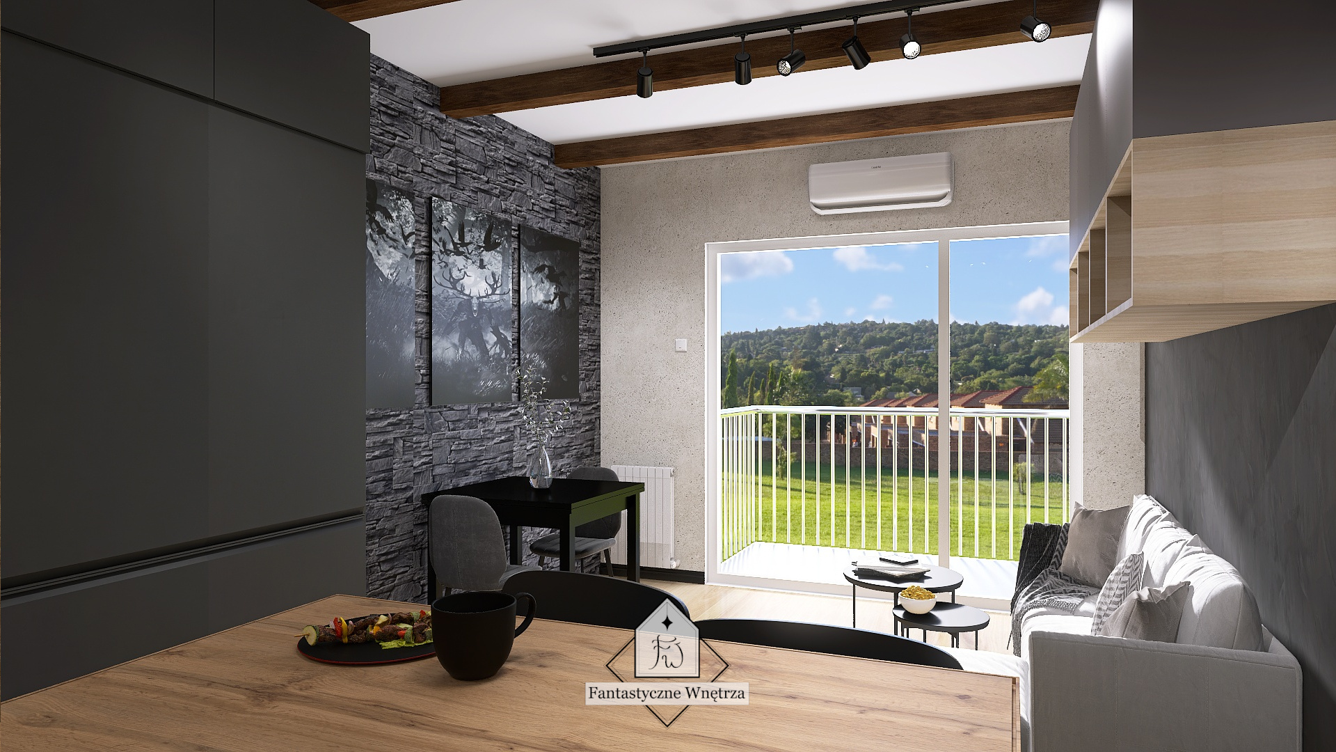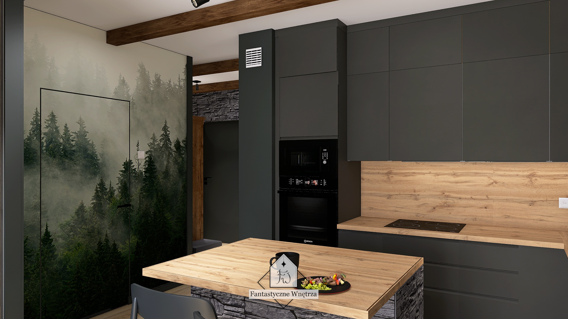 Cała część dzienna jest spójna i ma elementy wspólne. Od razu rzuca się w oczy imitacja drewnianych belek stropowych. Belki robią efekt „łał”, nadają wnętrzu „fantastyczności”. Drugi element, który powtarza się w całym mieszkaniu, to kamień dekoracyjny, który w części kuchennej pojawia się na wyspie.