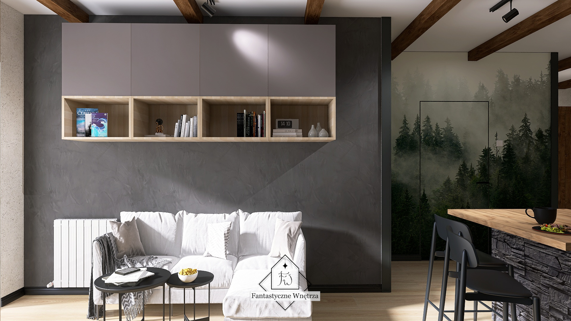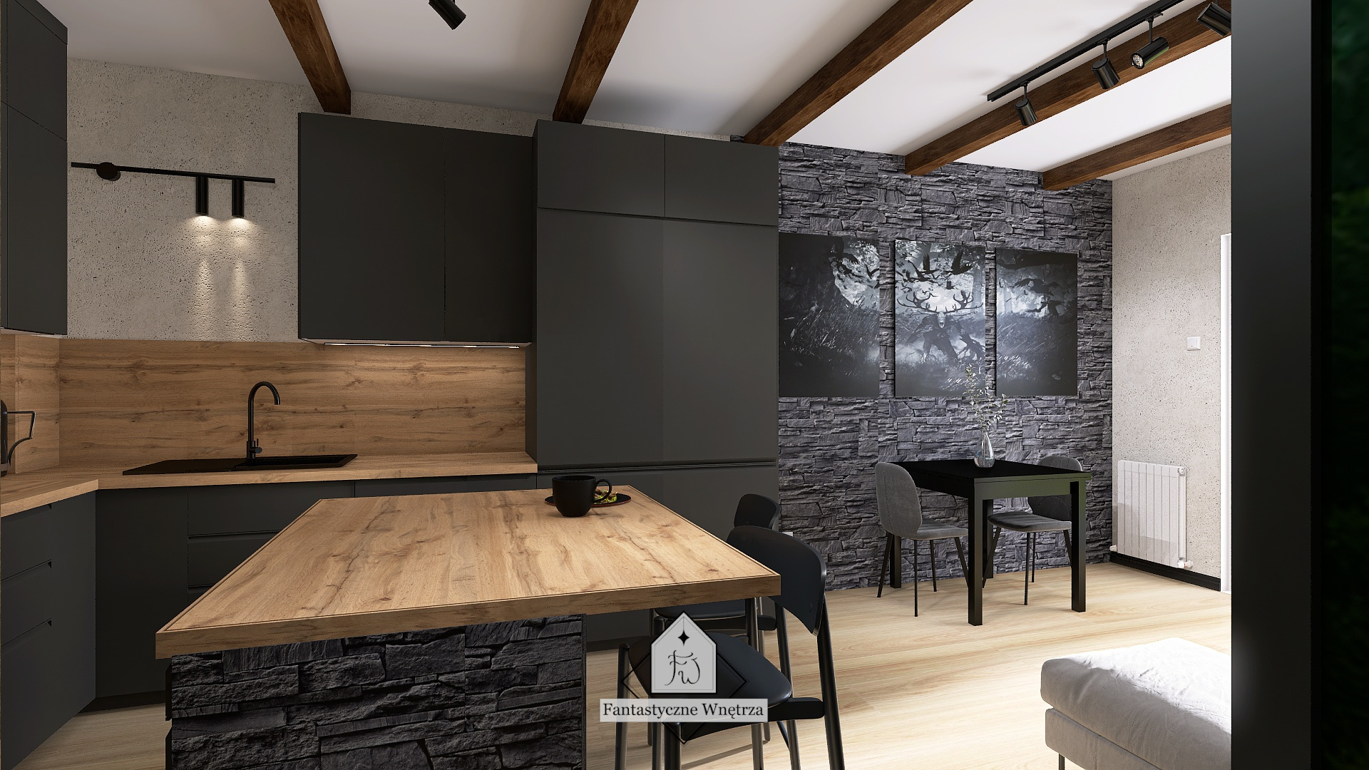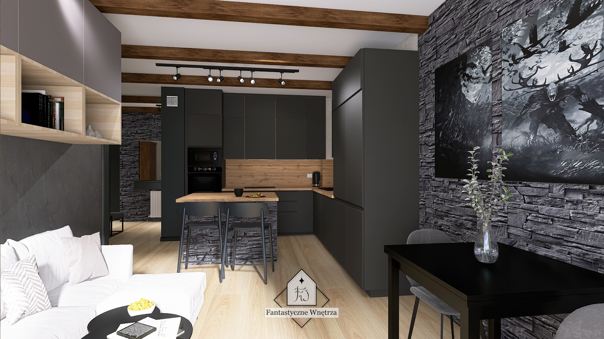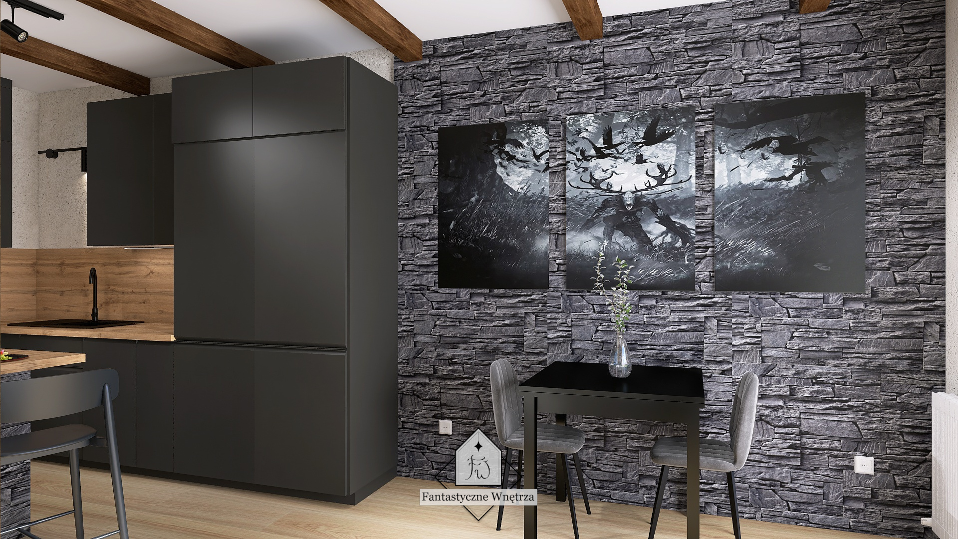 To fantastyczne mieszkanie zaprojektowane jest dla fanki fantastyki, która szczególnie lubi naszego rodzimego „Wiedźmina”. Ma w sobie nowoczesne rozwiązania i wystrój nawiązujący do klimatu fantasy. We wszystkich pomieszczeniach powtarzają się te same elementy, sprawiając, że całość jest spójna: kamień dekoracyjny, ten sam dekor drewna, antracyt, białe surowe wykończenia ścian.