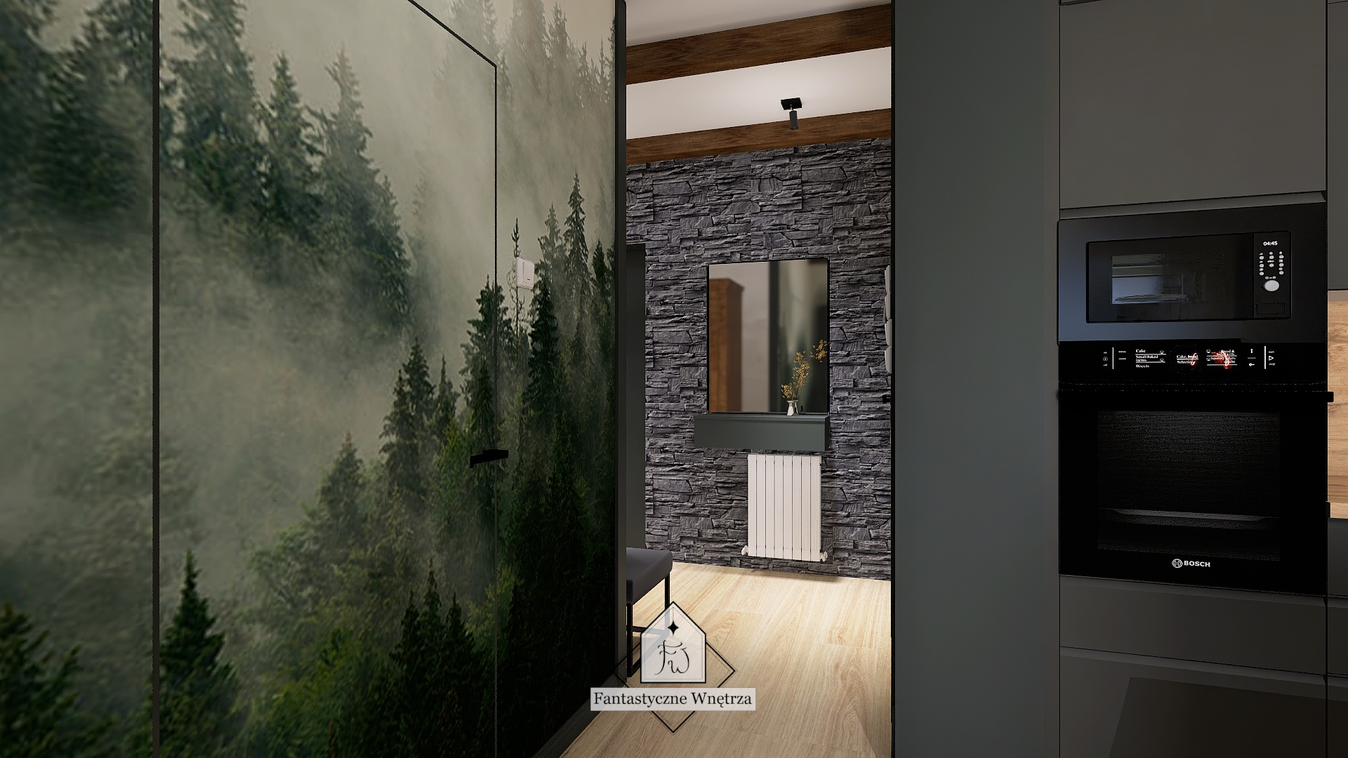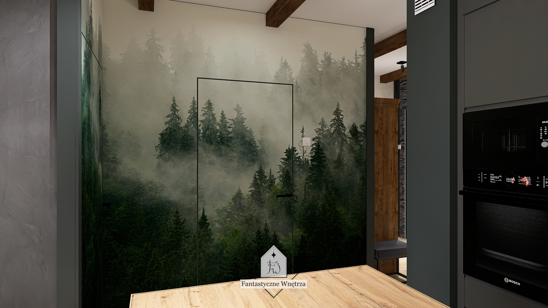 Wszystkie drzwi w korytarzu są zlicowane ze ścianą, a drzwi do łazienki oraz gabinetu dodatkowo są ukryte poprzez zastosowanie na nich fototapety. Wizerunek lasu świetnie pasuje do klimatu fantasy.