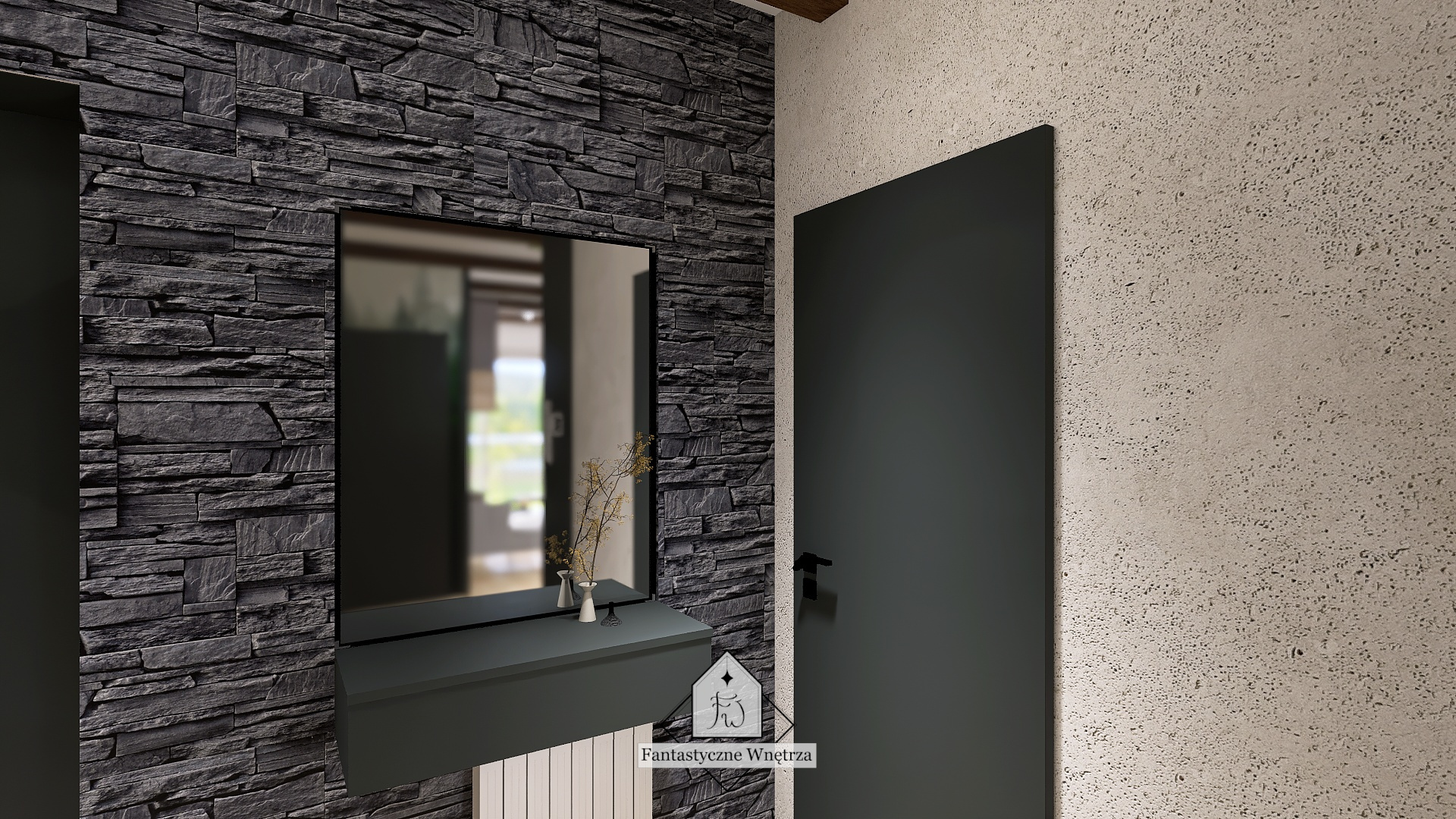 Cała ściana z drzwiami wejściowymi jest wykończona kamieniem dekoracyjnym, co sprawia, że od razu po wejściu do mieszkania mamy efekt „łał”. Kamień w połączeniu z imitacją belek stropowych i stylizowaną szafą ustanawia fantastyczny klimat mieszkania.