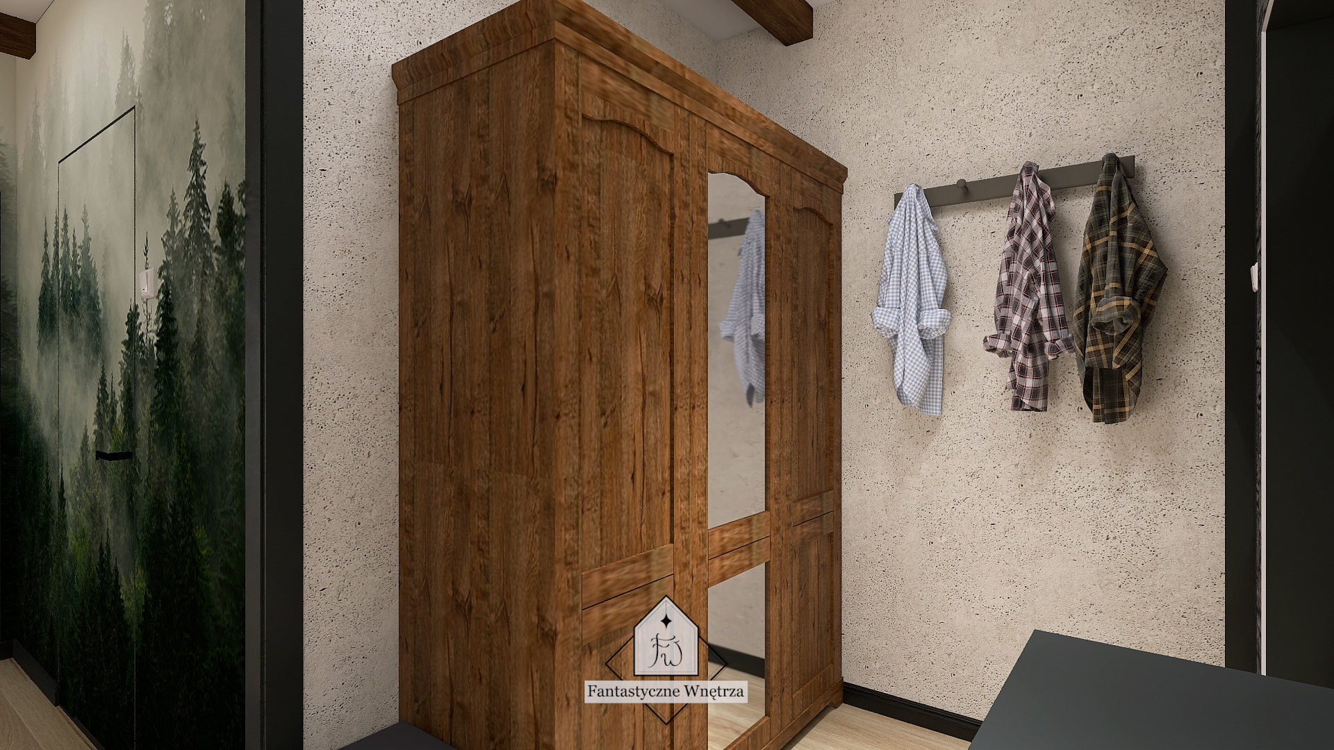 Naprzeciwko wejścia do mieszkania jest duża szafa. Wybrałam szafę zdobioną, pasującą do klimatu fantasy. Na ścianie obok mamy wieszak z haczykami na zawieszenie podręcznych nakryć. Przy szafie stoi siedzisko, które pozwoli na wygodne wkładanie butów.