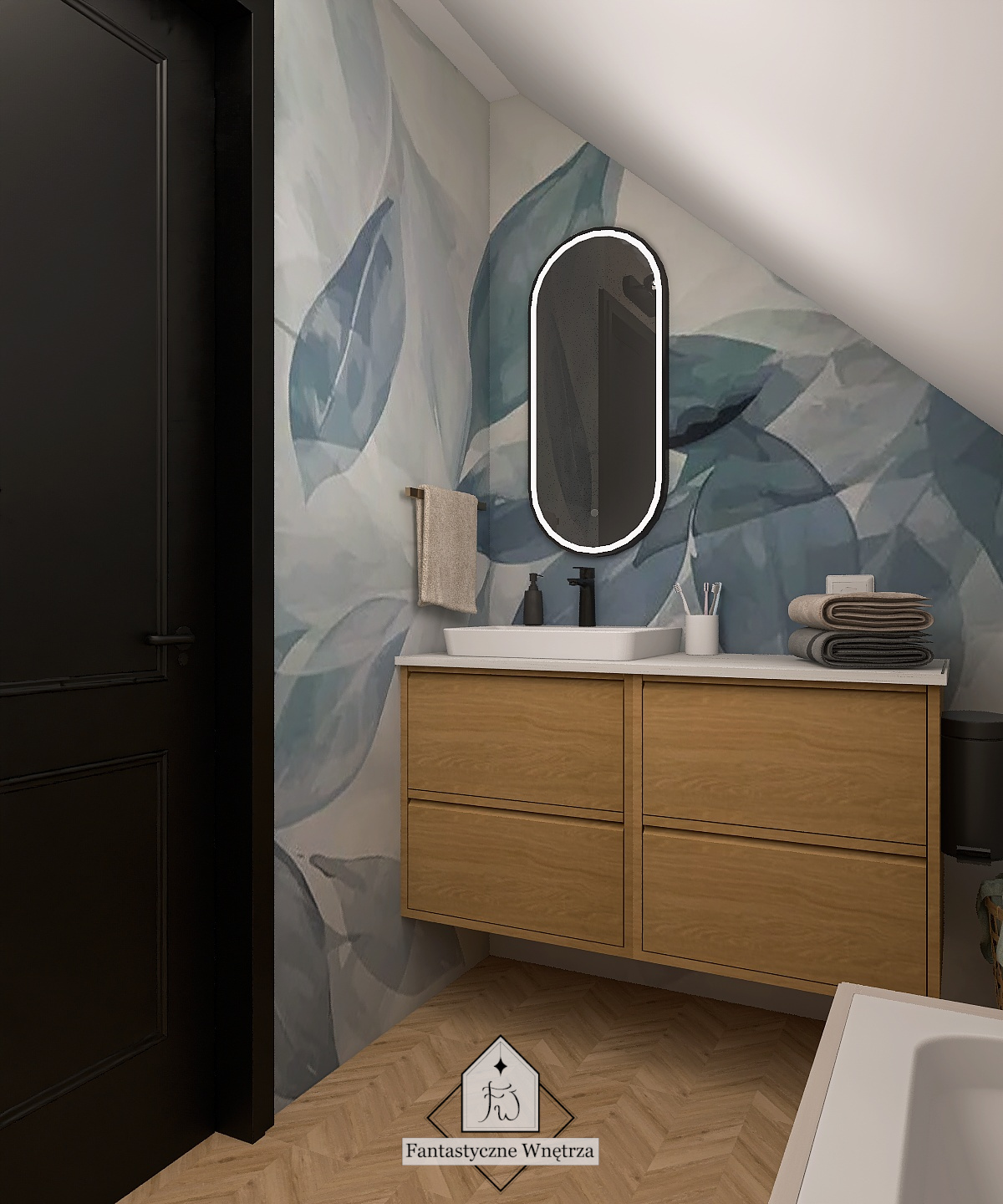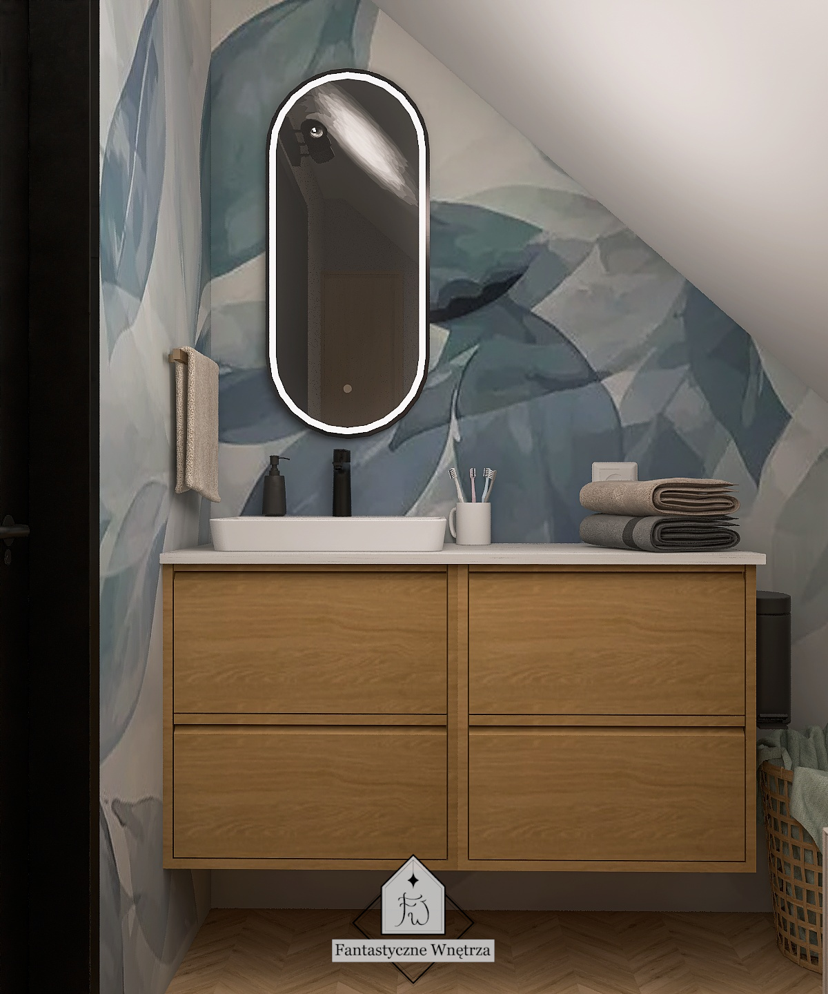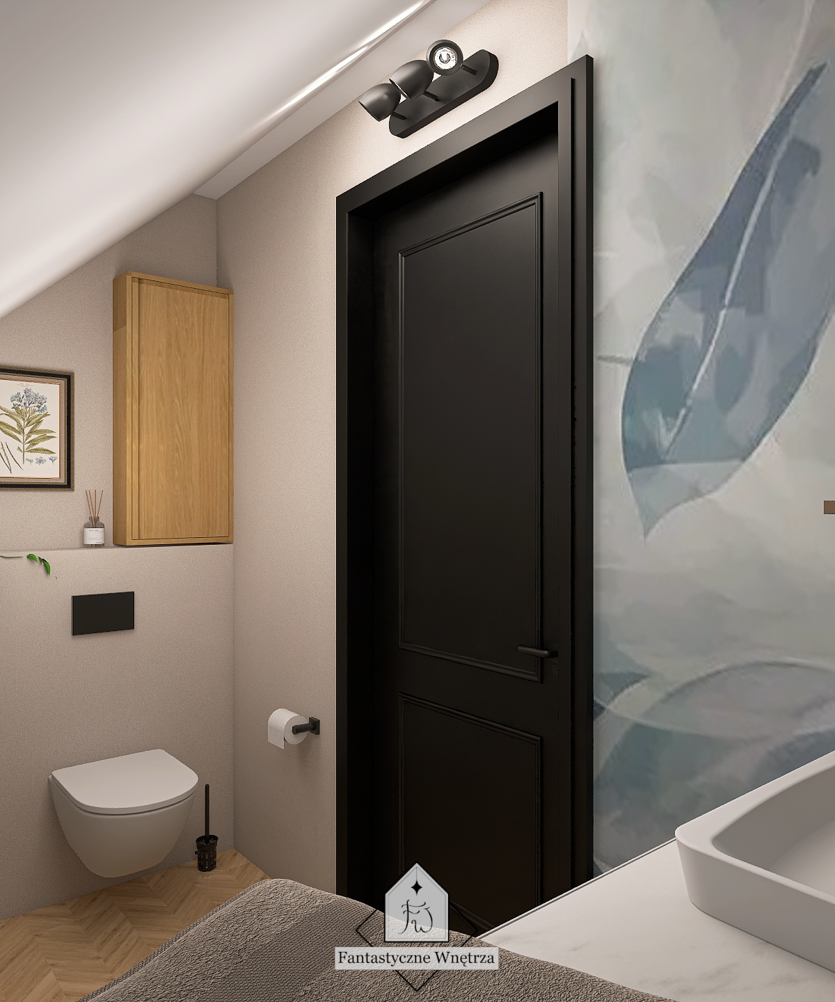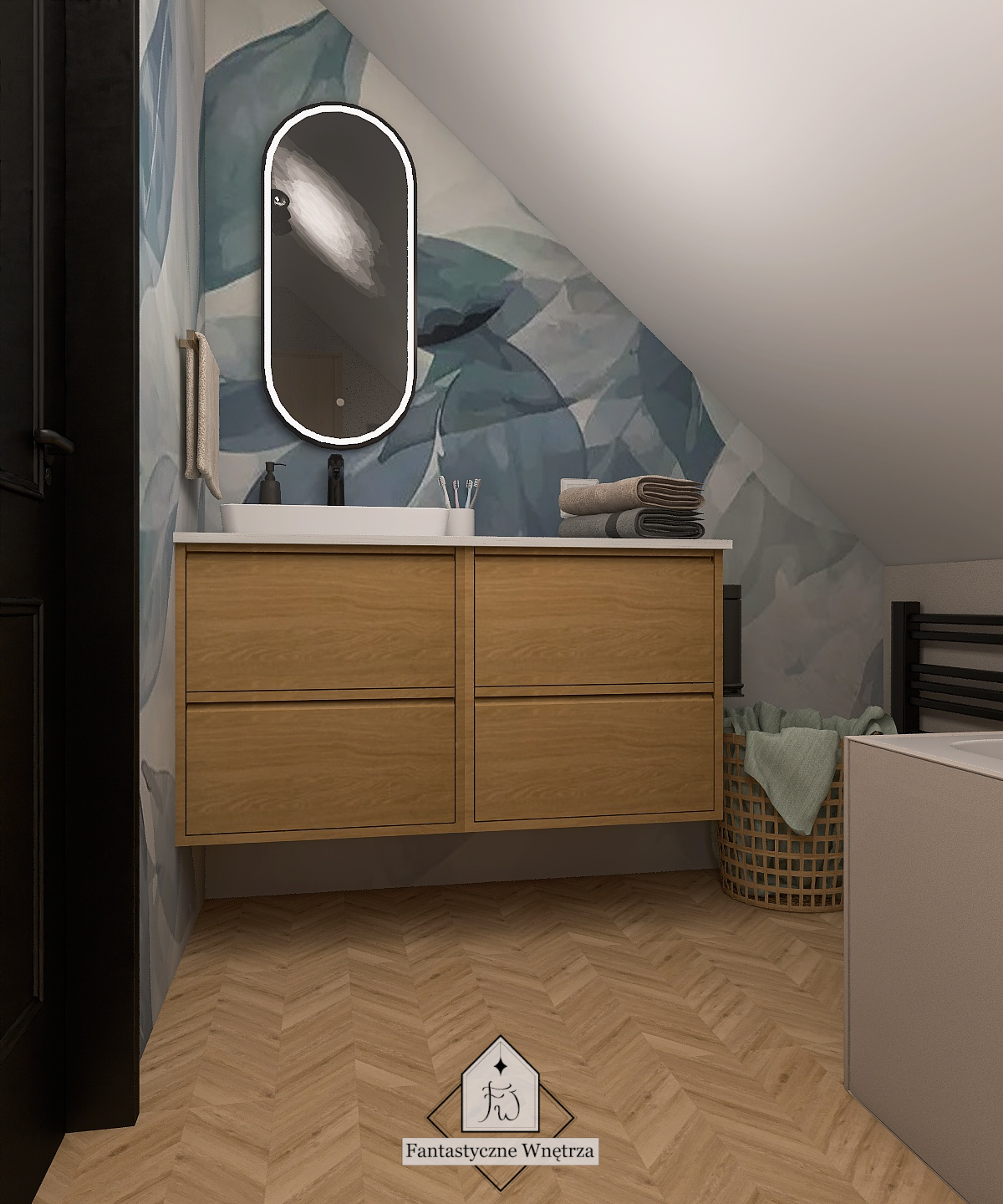 To pomieszczenie jest malutkie i dość niefortunnie całe jest pod skosem. Aby ułatwić wykończenie ścian oraz późniejsze sprzątanie – w tej łazience nie ma fug. Ściana za umywalką wykończona jest fototapetą o przyjemnym, relaksującym odcieniu niebieskiego. Pozostałe ściany oraz obudowa wanny wykończone są mikrocementem dedykowanym do stref mokrych. Daje on naturalne, przyjemne wykończenie.